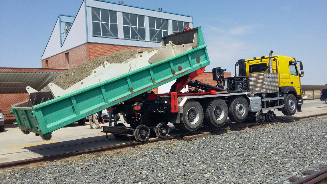 Voici un camion rail-route Volvo de type Multi-Benne et qui peut porter des bennes et apparemment d’autres structures, comme une bétonnière que j’ai vu sur le côté. Le camion rail-route évolue en Suisse, il paraissait tout neuf. En tout cas, c’est la première fois que je vois un camion rail-route avec un crochet de type polybenne. J’essaierai d’avoir plus d’infos à la rentrée.
