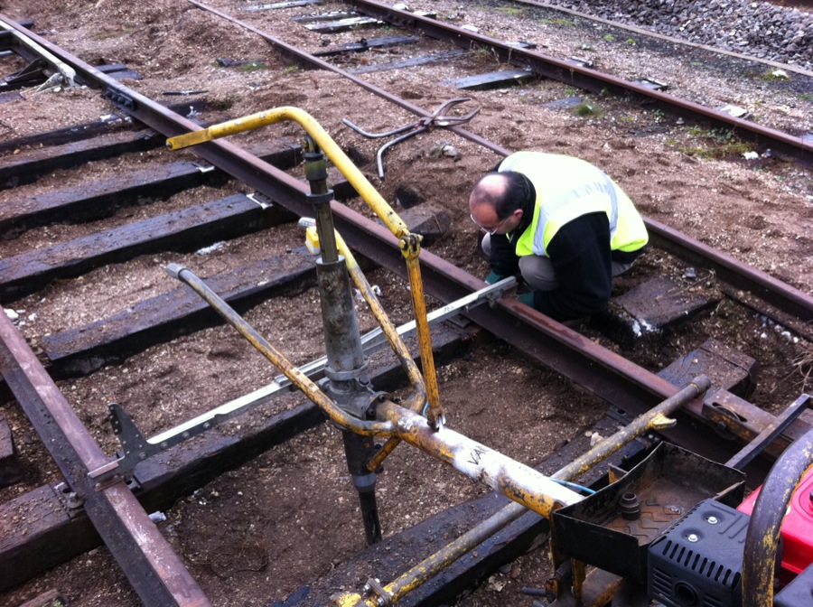 Dévissage des éclisses tenant les rails entre eux : Gilbert (arc et Senans) ne touche plus terre, mais il y est arrivé quand même.