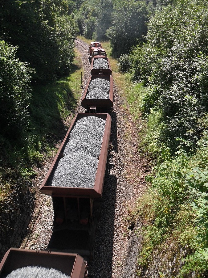 Arrivée d'une rame de 11 ballastières chargées avec une UM en tête de convoi au fond sur la photo et une UM en pousse
