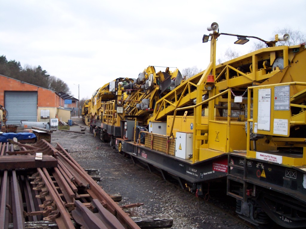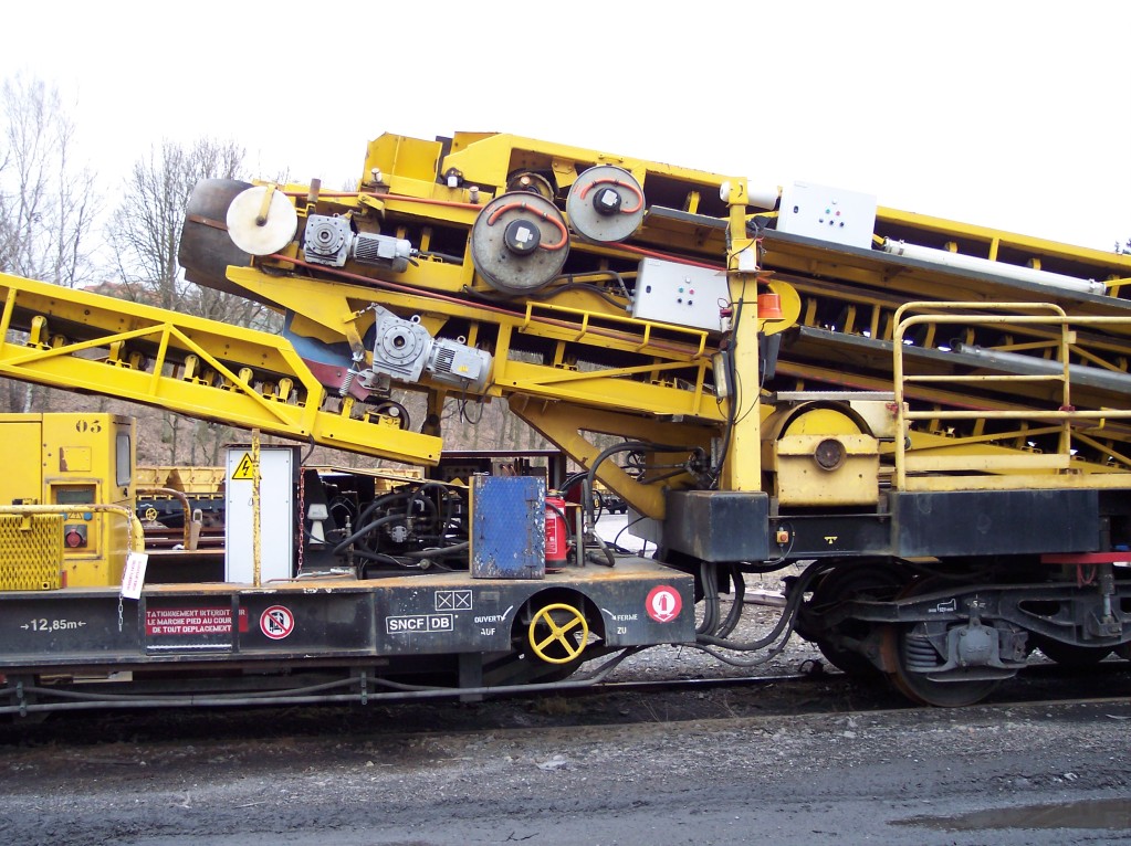 Que sont ces sortes de bennes jaunes (sans doute amovibles) sur les wagons plats?Pour le ballast usagé je m'en doute mais leur forme?Ce pourrait être intéressant à reproduire sur un wagon.