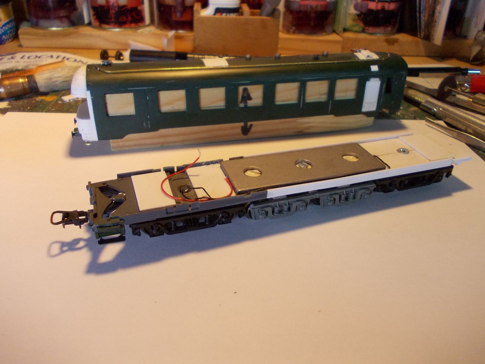 Voici une petite avancée,cette fois ci sur le châssis et le bogie central , pour lequel j'ai suivi le procédé de B.Bransol qui va très bien.Aucun problème de circulation dans les courbes.Encore quelques finitions et l'intérieur à reproduire avant la mise en peinture.Comme le dit Bruno ,je me suis basé sur les plans de B.Bransol ,ce qui facilite beaucoup les choses.Par contre si quelqu'un possède des plans des autres voitures Mauzin je suis preneur :D