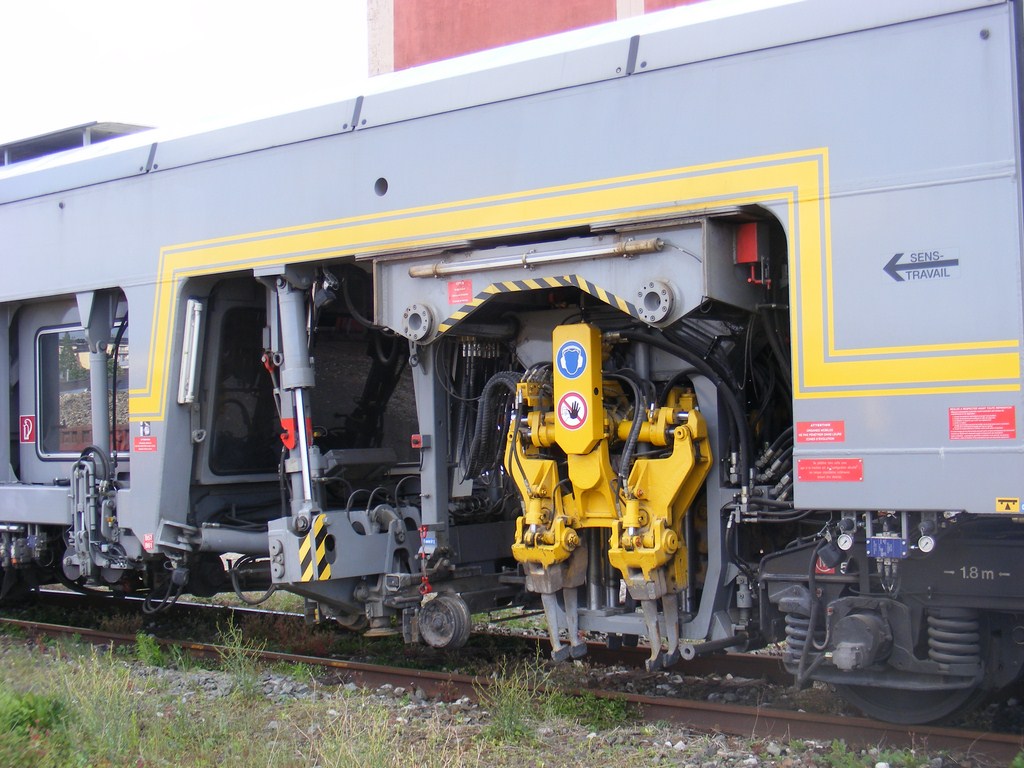 C'est le bras pour la 3ème file de rail. Ca sert à bourrer les appareils, pour soulever la voie déviée en même temps qu'on bourre la voie direct, très utile pour éviter de créer un gauche dans la voie dévié tout en bourrant la voie direct et ça permet également de bien caler la voie dévié depuis la voie direct avec le déport des groupes de bourrage.