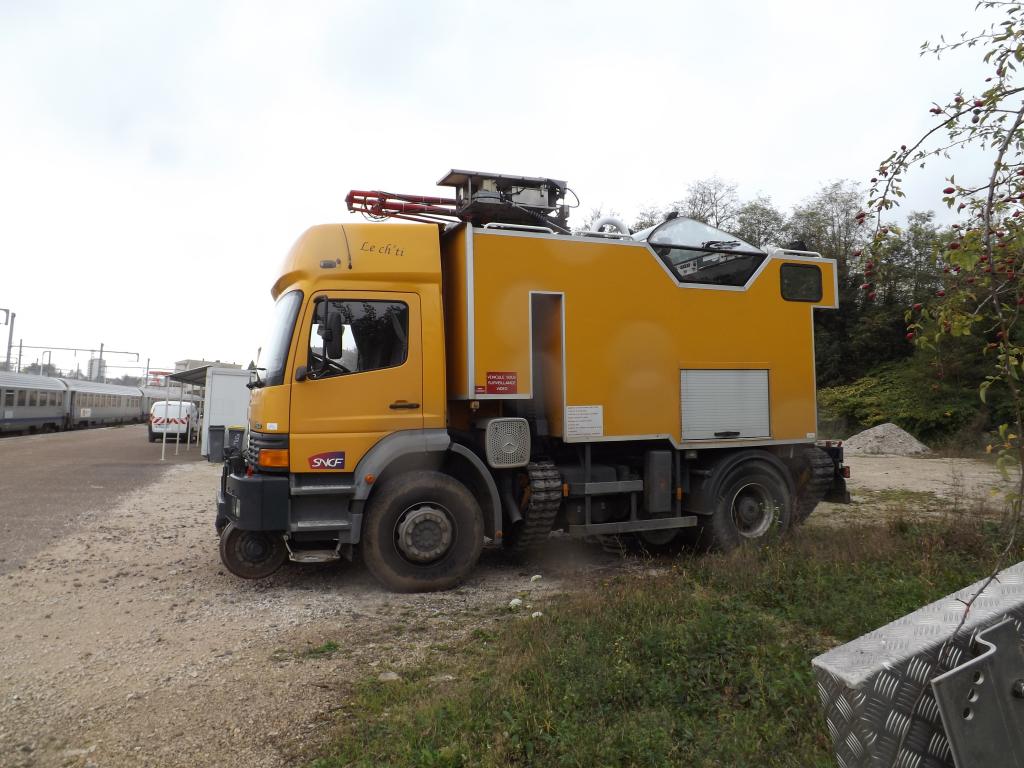 Ce type de véhicule (j'ai un trou de mémoire pour son nom) ne permet pas d'intervenir sur la caténaire, par contre il sert à enregistrer les paramètres géométriques de la caténaire grâce à son pantographe spécial. En même temps, les agents prennent place dans la vigie et observe les installations en étant positionnés pratiquement au niveau du plan de contact.
