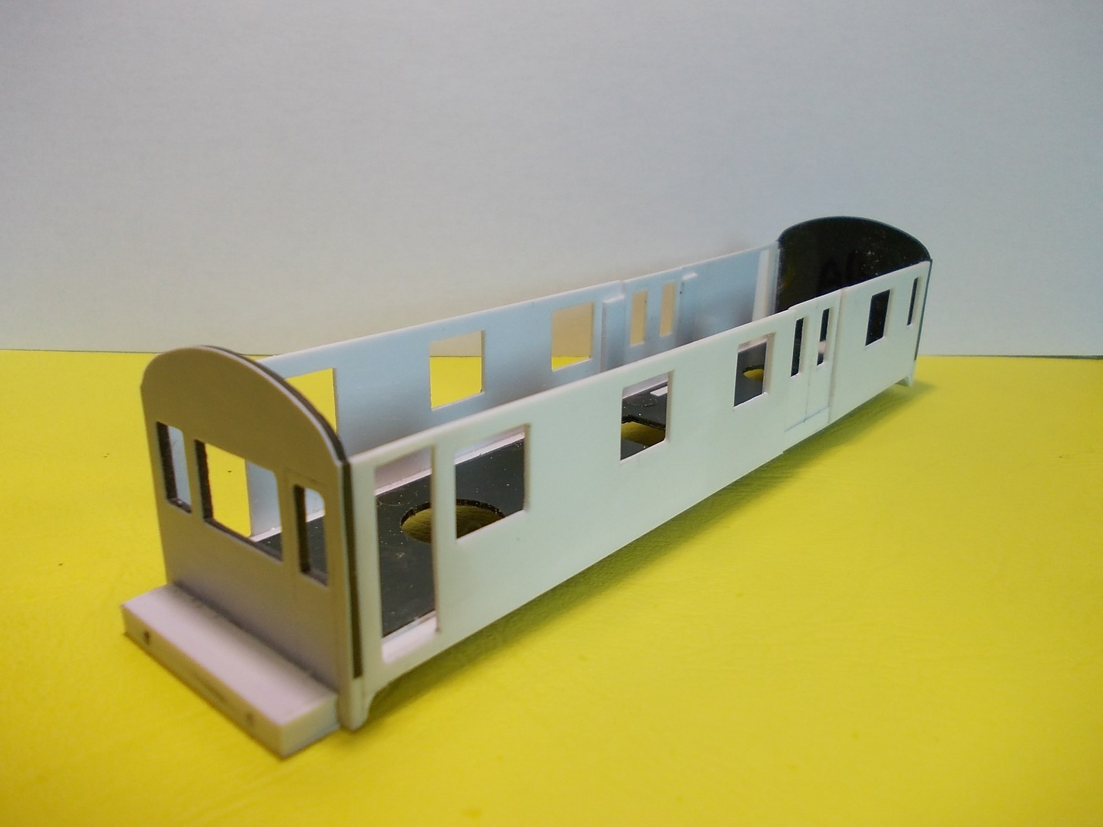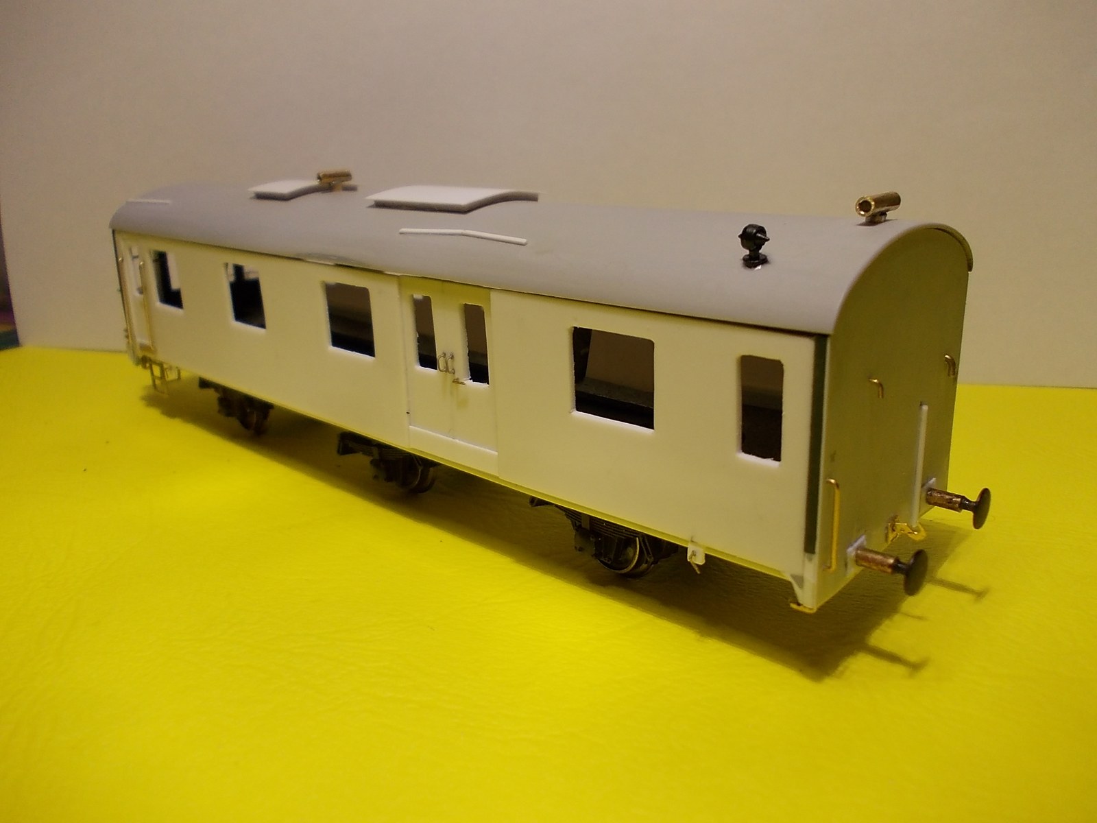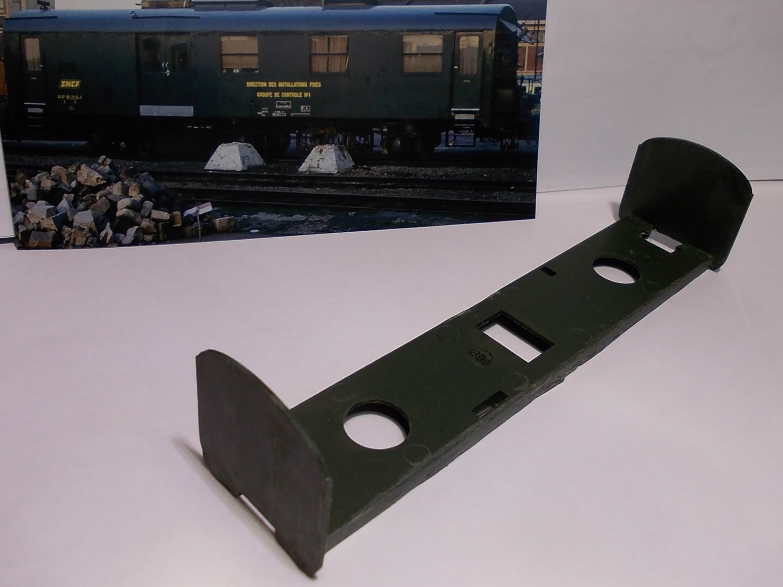 La base utilisée,enfin ce qu'il en reste est une "trois pattes" Fleishmann,une partie de la caisse bien réduite,la toiture et les organes de roulement.