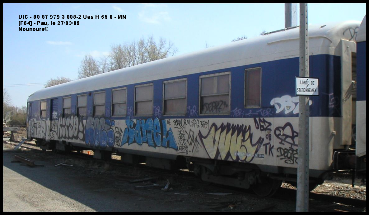 Voici la voiture de cantonnement 80 87 979 3 008-4 Uas H55 0 - F SNCF-MN (ex B5Dd2 UIC 50 87 82 70) avec le wagon de contôle