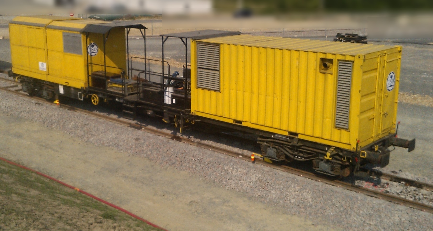 Ce wagon porte deux conteneurs: un pour le groupe électrogène et l'autre pour la tête de soudure électrique qui doit être montée sur une grue ou une chèvre.