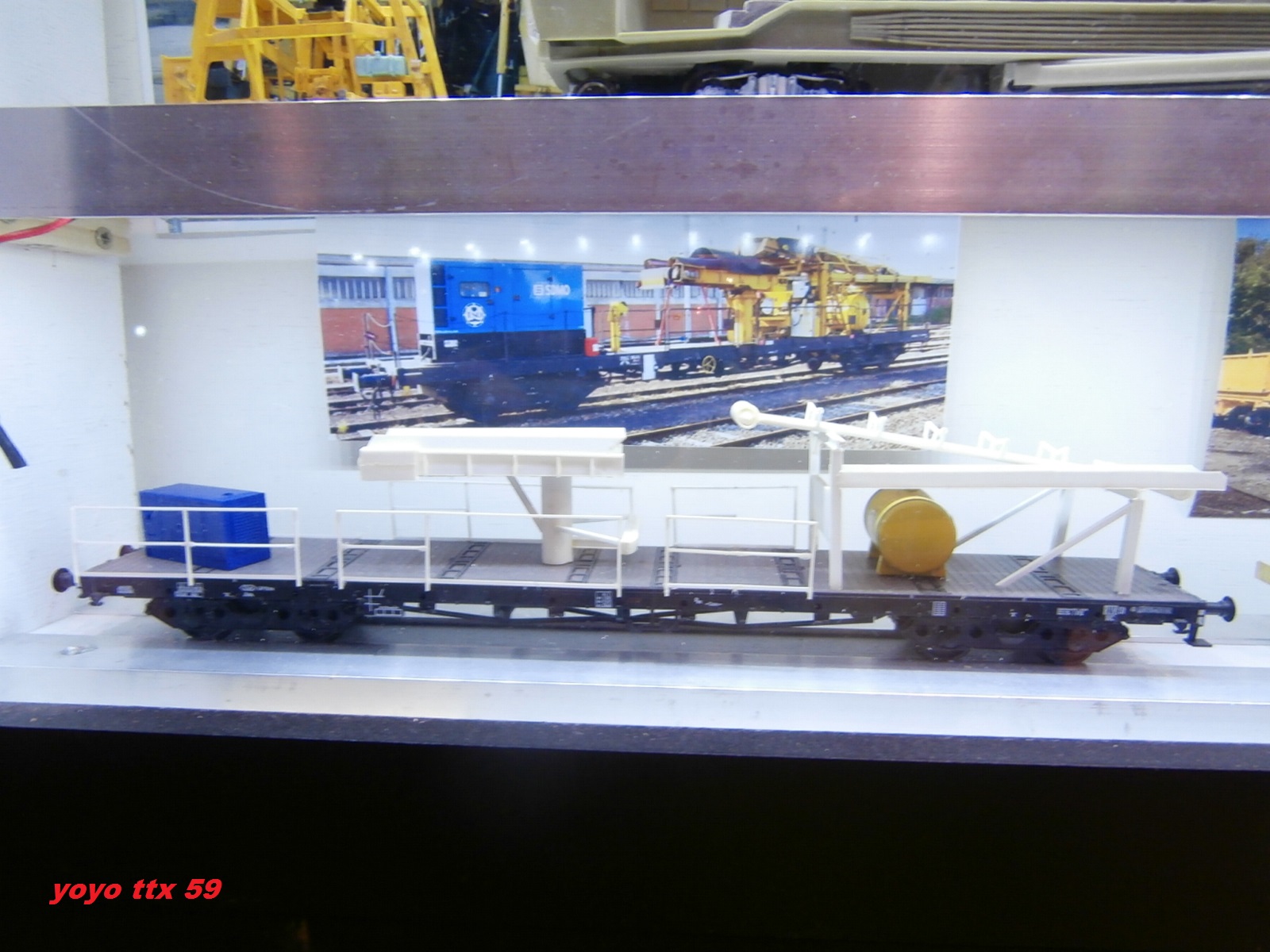 je me ré-attaque à mon wagon énergie , j'ai refait les chandelles qui supportent la bande transporteuse en fer H plus gros ,ce qui est plus conforme à l'engin réel , voilà les photos avec la passerelle en plus