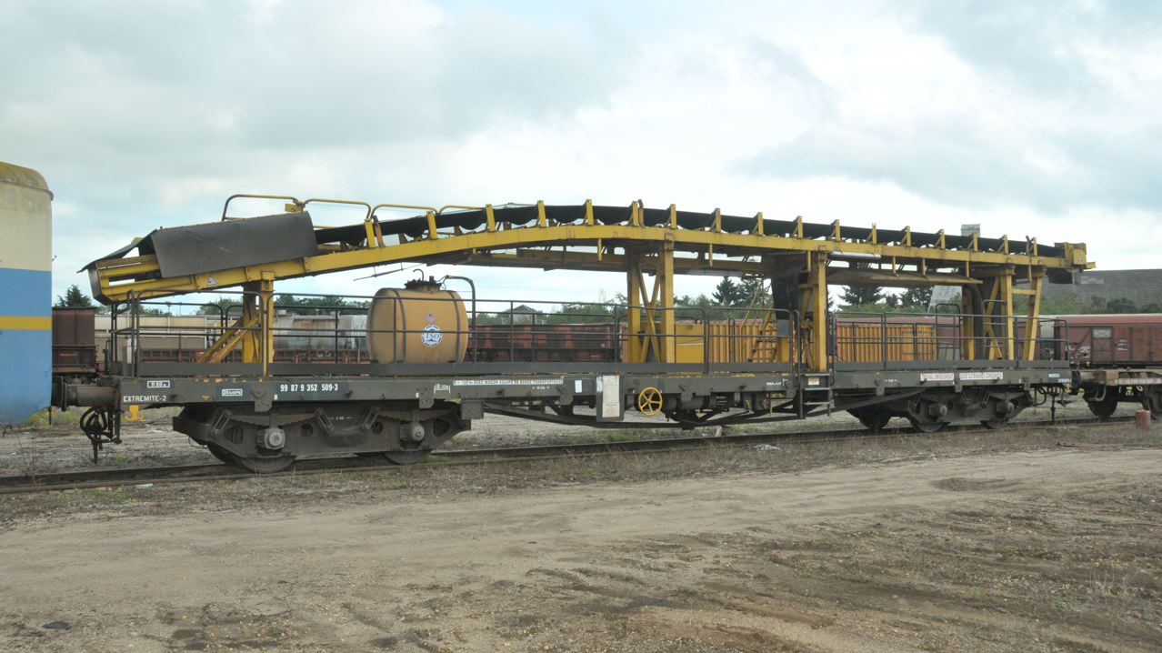 Voici une nouveauté ici (je pense), le 99 87 9 352 509-3, un "tapis-roulant" sur un châssis plat a bogies UIC (ou Y19 dans la vocabulaire SNCF), Rs ou auparavant Rory dans la vocabulaire SNCF.