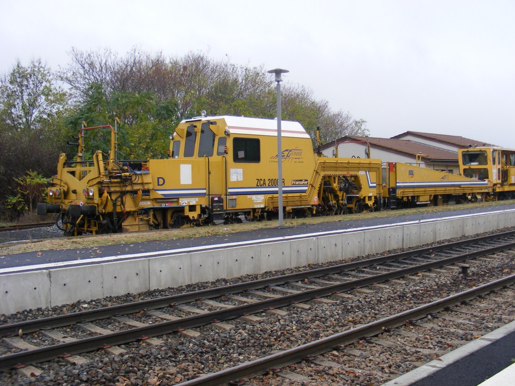 Voici la ZCA 2000 R d'E-Génie à Pau le 20/12/08, elle vient juste d'être acheminée car tous les organes de mesures et de bourrage sont encore maintenus par les chaînes.