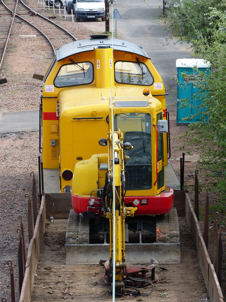 Rame de travaux Meccoli en gare de Tours le mercredi 08-04-2015 pour le RVB de la ligne de Poitiers entre la passerelle de la gare et les