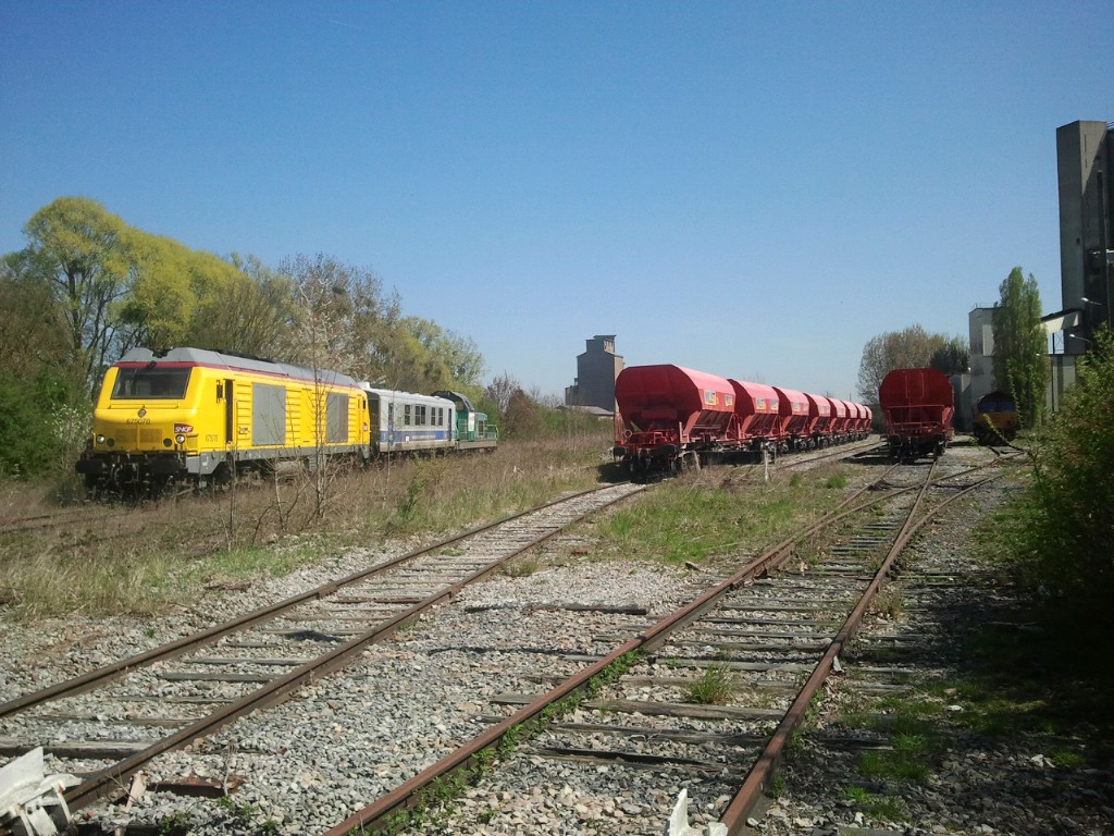 75076 + Mauzin 212 + 69454, Bresles, 22/04/2015 (le train s'est arrêté à l'ITE avant la gare de Bresles, il n'a pas osé aller jusqu'à la gare [où était embranchée la sucrerie] vu l'état de la voie !).