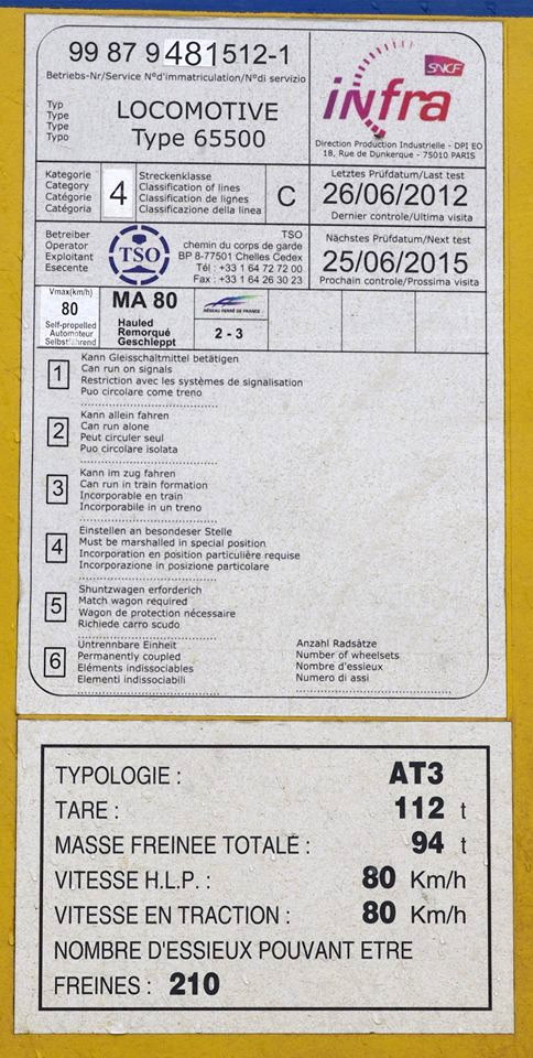 l'ex-CC 65512 SNCF, dans sa livrée TSO. En action sur la base-travaux de Villognon (Charentes), dans le cadre du chantier TGV Paris-Bordeaux. Prise de vue: Alain Dupire, en Mars 2015. avec l'autorisation de mon Gilles Lefranc (Facebook)