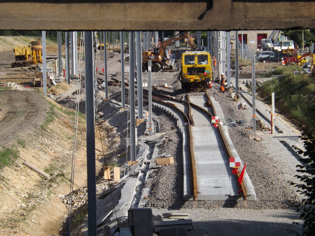 De nouvelles aiguille son aussi en place L'ensemble de la voie est presque entièrement monté côté Belfort. Le ballast cachant certaine partie.