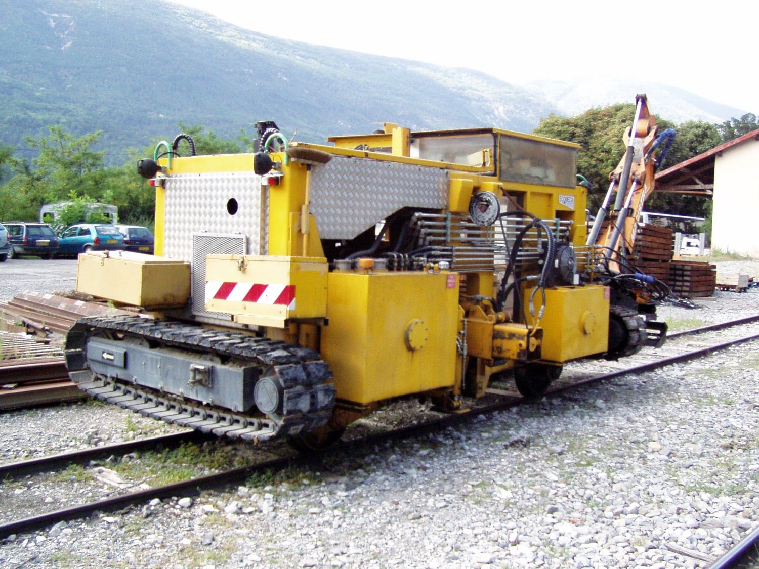 Les chenilles permettent surement de le charger sur un plateau et peut etre d'atteindre les talus trop eloignés de la voie. C'est une ligne à trtaffic faible qui ne necessite pas de moyens lourds et couteux.