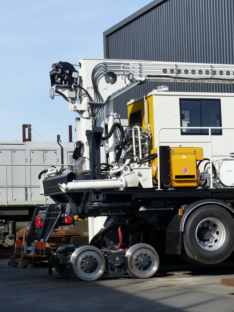 La grue portique a une capacité d'environ 30T/m une fois que les stabilisateurs sont sortis donc camion à l'arrêt. C'est un développement propre à Socofer optimisé pour l'utilisation sous caténaire et dans toute configuration de dévers. En effet, les grues d'origine routières ne fonctionnent correctement qu'à plat et leur cinématique est incompatible avec la caténaire, à un moment ou un autre les bras touchent la caténaire si on veut manipuler une charge au pied dufût de la grue.