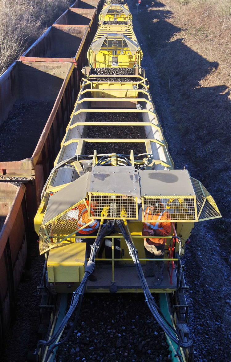 la rame de travaux avec des wagons plats pour le ballast pour la nouvelle voie ferrée