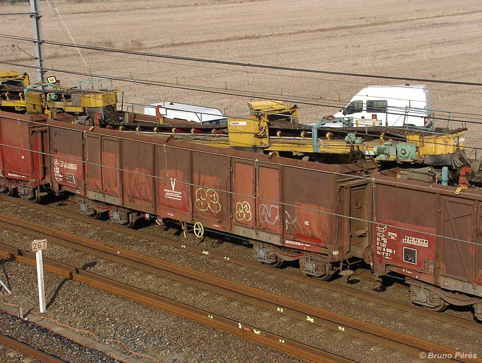 Ces bandes transbordeuses (est-ce le nom véritable ? J'ai déjà lu tapis ou encore convoyeurs ...) existent sous plusieurs types. Voici celles utilisées actuellement par l'entreprise ETF. Le soc peut avancer ou reculer, se lever ou se baisser alors que la bande peut basculer de droite ou de gauche, tout ça pour répartir au mieux le vieux ballast dans les différents wagons d'une part, et d'autre part dans chaque wagon. Mais des photos valant mieux qu'un long discours, en voici 4 prises entre novembre 2007 et février 2008 entre Toulouse et Montlaur.