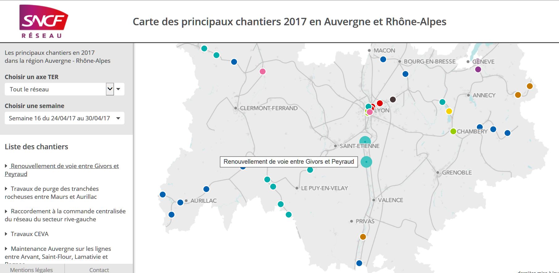 le lien pour la carte des travaux Carte des principaux chantiers 2017 en Auvergne et Rhône-Alpes
