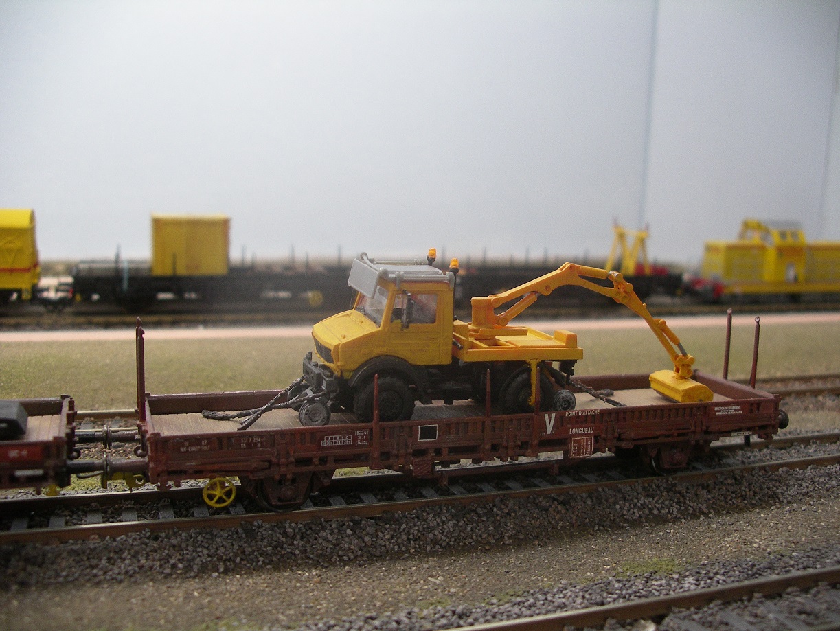 Pour poursuivre sur l'utilisation du wagon WSGI, dans d'autres fonctions que celle d'origine, et afin de créer des idées, je vous propose une rame de l'équipe régionale mécanisée d'AMIENS (Somme), dont j'avais aperçu, à l'époque, la composition en gare d'ABANCOURT (Oise). Maintenant, les tracteurs rail-route équipés d'une épareuse sont acheminés par route. J'avais d'ailleurs illustré cette rame dans un article paru dans R.M.F.507 d'octobre 2007 sur les rames de débroussaillement (et non débroussaillage)