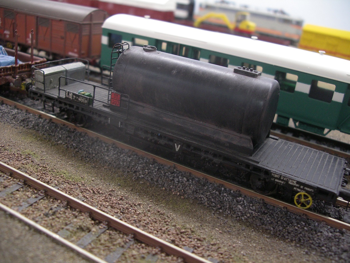 J'ai récupéré quelques photos argentiques, support à la réalisation partielle de cette rame, dont le but était l'intégration du wagon de transport de produits pétroliers, ayant pour point d'attache LE BOURGET (GELEV ?), dont la réalisation a fait l'objet d'un article dans R.M.F. 504 de juillet 2007.