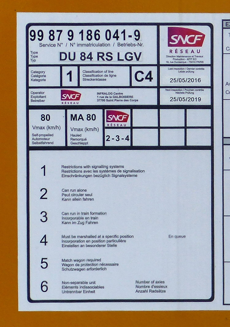 DU 84 RS LGV 9-820 - 99 87 9 186 040-1 SNCF RESEAU (Agrément de travail MTPP 15 122 - 25-05-2016 / 25-05-2016)
