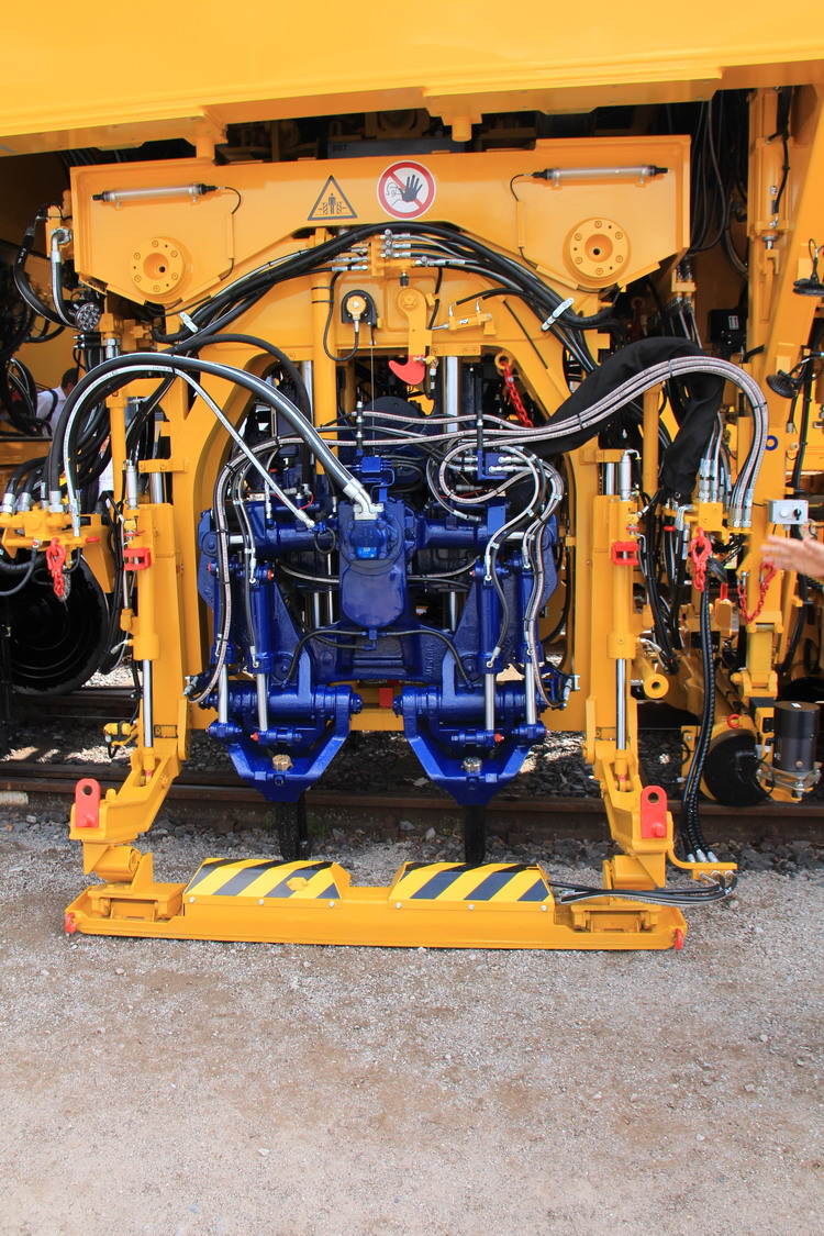 Les machines Plasser & Theurer sont dotées de groupes pivotants, et grâce à la technologie Split-Head, ceux-ci sont divisables longitudinalement et translatables latéralement. Les bourroirs sont quant à eux escamotables. En raison de la régulation de la vitesse de rotation des groupes de bourrage, il est également possible de traiter efficacement, et en produisant un minimum d’usure, les zones où le lit de ballast est colmaté. Les différents dispositifs pour le relevage et le dressage de la voie saisissent le rail par le patin ou par le champignon, et sont translatables latérale­ment en présence d’obstacles. Le dispositif de relevage supplémentaire de la troisième file de rails intervient pour traiter les appareils de voie lourds sur traverses béton, notamment dans la zone des traverses longues.