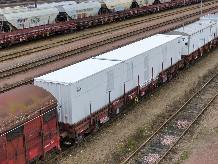 - 80 87 979 4 738-5 Uas R55 6 F SNCF-NT (wagon plat à bogies avec bungalow)