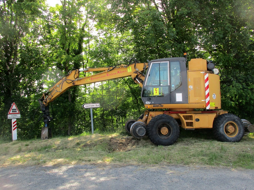 Ce samedi 5 Juin 2021, entre Tulle et Gare de Corrèze une pelle Rail Route à friction D2r WX 170 de l'entreprise Ferroviaire Rhône Alpes stationne près du PN au lieu dit "la maison brûlée". Probablement en rapport avec les travaux programmés sur le tronçon Tulle Ussel (en bas de page) :