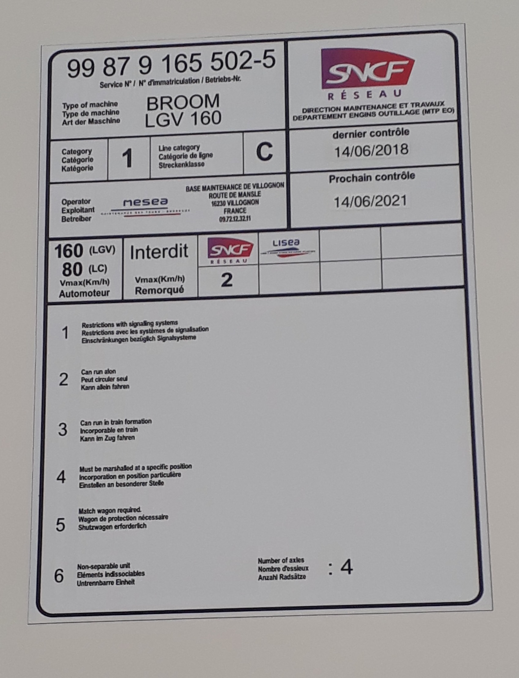 Voici la deuxième Draisine BROOM LGV 160 plaque constructeur (SOCOFER numéro de série 968 2017)
