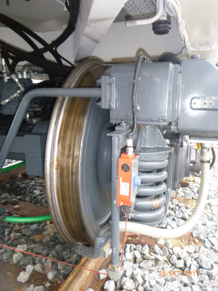 Nous pouvons voir les outils, l'énergie, les cabines, les sièges pour les ouvriers, l'extraction des gaz de soudure, le treuil pour manipuler les traverses et leurs points de stockage de part et autres du treuil. les trois treuils pour les coupons de rail (par fil de rail) six en tout.