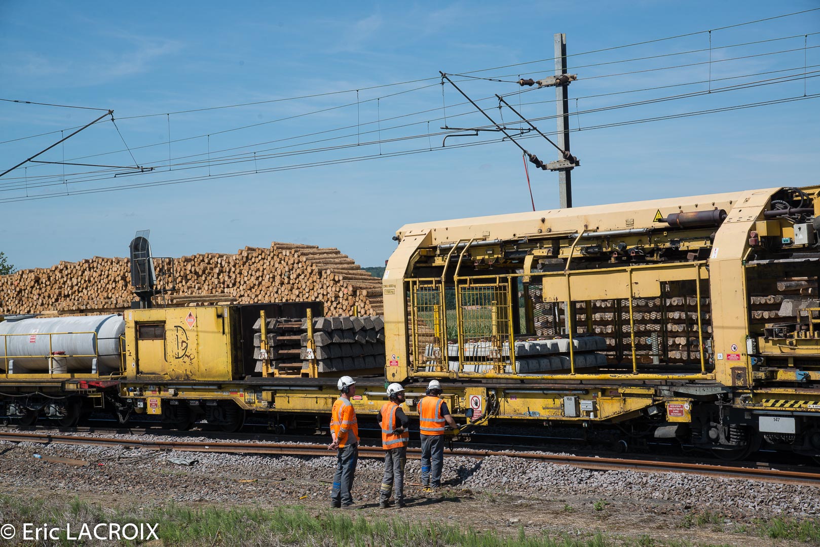 Ensuite nous arrivons au niveau du train de dégarnissage qui a été scindé en deux pour les travaux. A l'arrière se trouve le train de wagons de ballast poussé par la G.1206 99 87 9 181 537-1 de la Dijonnaise de Voies Ferrées.