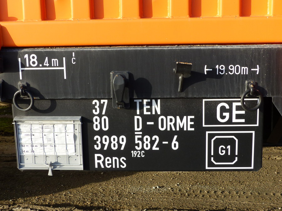 Voici le wagon 37 80 3989 582-6 Rens 192 C - TEN RIV D-ORME de la société On Rail Gmbh (Allemagne) pour la société de location de wagons M.F.I sa (Matériel Ferroviaire et Industriel) de Strasbourg qui est une société spécialisée dans l'achat-vente, la location,