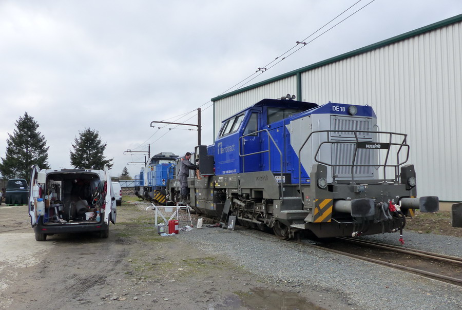 La voici après désaccouplement pour manœuvres de sa sœur ( 005-3 ) aux ateliers des Flandres ( Colas Rail ) :