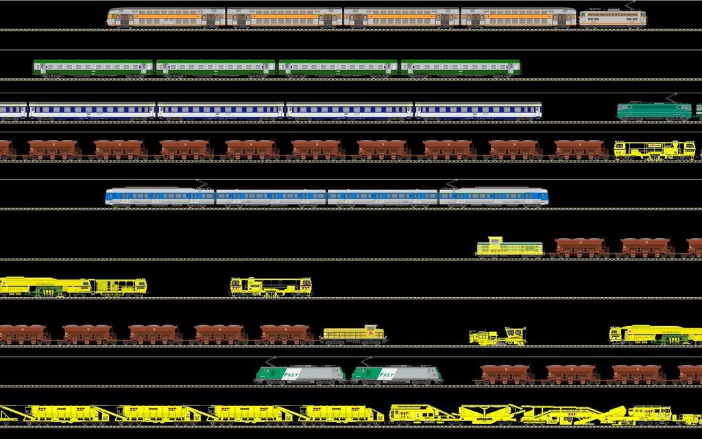 dans la version que je viens de charger, il y a des V211 TSO, COLAS, des BB63000 COLAS, des CC65500 colas, drouard freres, ETF et des G1206 COLAS. Il y a des wagons de ballast. Il faut ensuite créer des macros pour ne faire tourner que ces engins et c'est difficile pour l'instant. PEut etre dans une prochaine version, il y aura des TTX?
