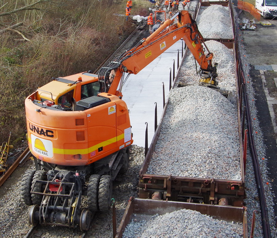 mise en place des traverses béton avec la Pelle Rail route CASE 788PRR n°CGG0229086 de Colas Rail F 62000 43 à Jussy le 14-02-2018