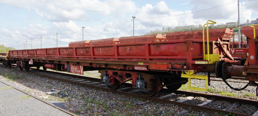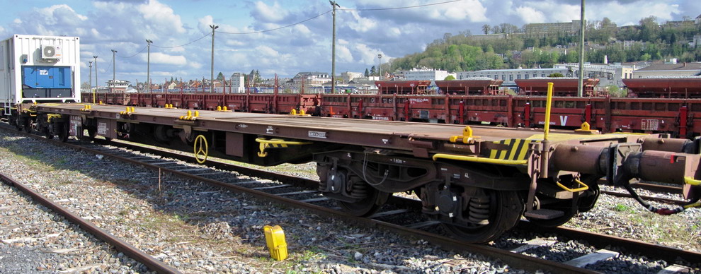 les trois wagons plats à bogies porte container ou bungalow en location sur la base de travaux de la gare de Laon le 13-04-2018