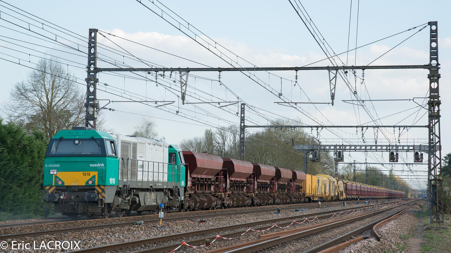 G 2000 BB 5001616 - 92 88 2272 005-0 B - ETMF en pousse du train de dégarnissage Matisa C-75 - 99 87 9 314 507-4 GCF Roma sur le RVB voie 1 bis à Villeneuve la Guyard (89) en mars 2017.