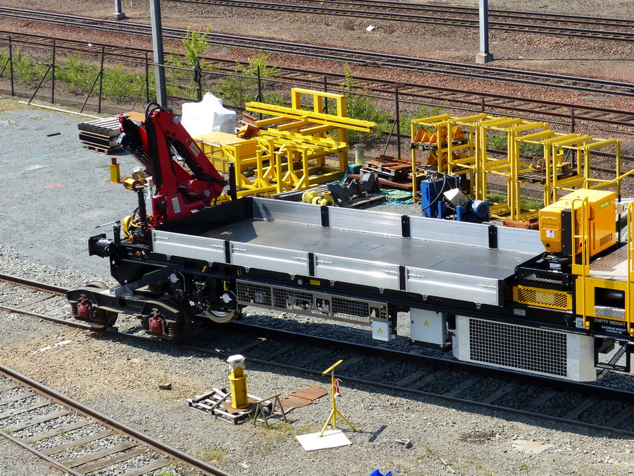 Une des draisines pour le Pakistan Railways sortant de fabrication des ateliers de la Socofer à Saint Pierre des Corps en photos la n°6 série A0114 avec essieux pour voie large 1676 mm ce qui explique les bogies pour déplacer sur voie normale