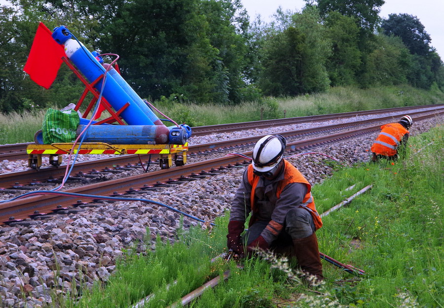 suite du reportage de Gtr Lefèvre entre la gare de Jussy et les ponts de Bray (02) pour une séance de coupage de coupon de rail de 18 m avec un chalumeau coupeur oxygène + acétylène par une équipe de Meccoli avec SNCF Réseau