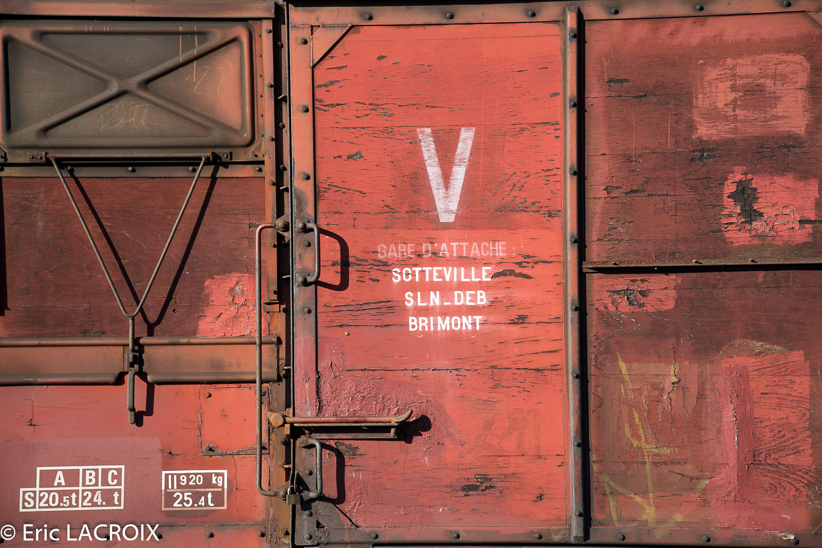 Voici le wagon 40 87 959 0 220-9 Us G54 4 SNCF-RO - gare d'attache Sotteville SL N-DEB Brimont avec la voiture de cantonnement