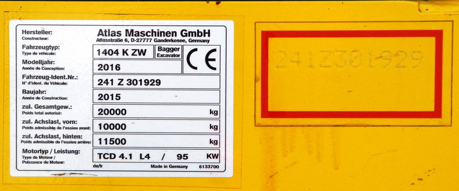 Voici la Pelle Rail route Atlas 1404 KZW n°241Z301929 de 2015 pour ETTB location TP n°460 avec marquage MZ