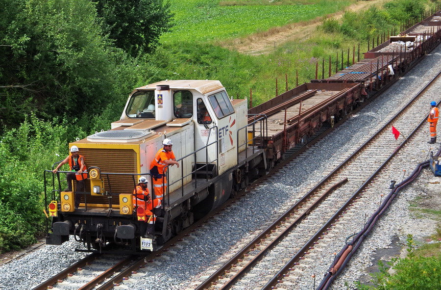 passage du train F1F2 de ramassage de fin de chantier sur le RVB à Jussy (02) le 05-07-2018