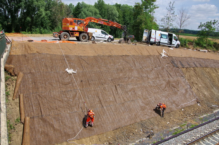 pour la mise en place des rouleaux de géotextiles en fibre de coco naturelle biodégradables et écologiques. de la société Tensar
