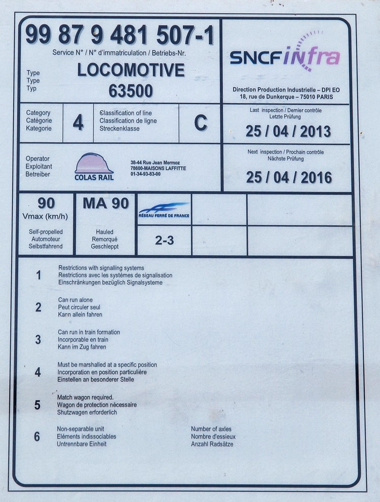 - Numéro actuel : 99 87 9 481 507-1 - Colas Rail F60000 07