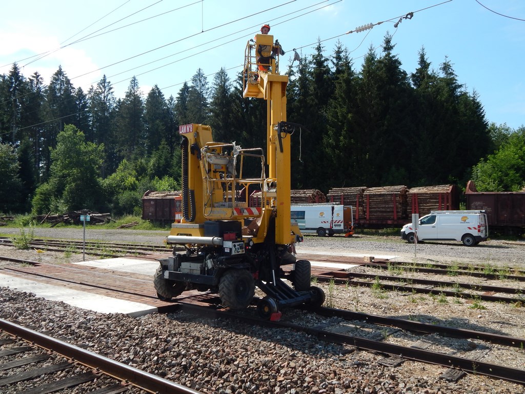 le 18/7/2018 Colas rail intervient sur la caténaire en gare d'Andelot en montagne (39)