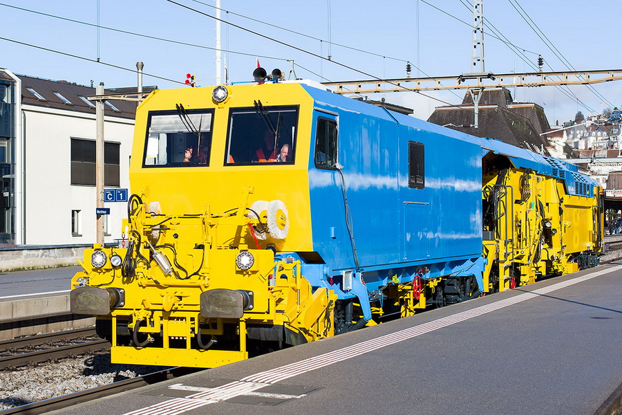 La voici pendant une marche d'essai avant sa livraison en avril 2014 de passage en gare de Montreux (Suisse) le 27 février 2014