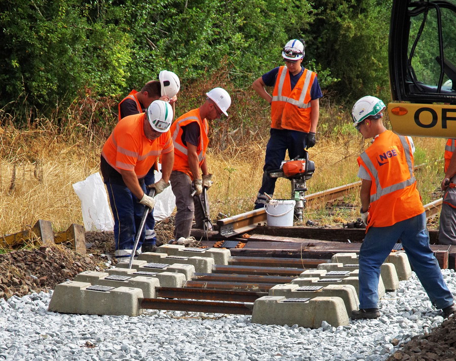 mise en place des novelles traverses en bois à la jonction de l'ancienne et de la nouvelle voie au niveau du PN n°92