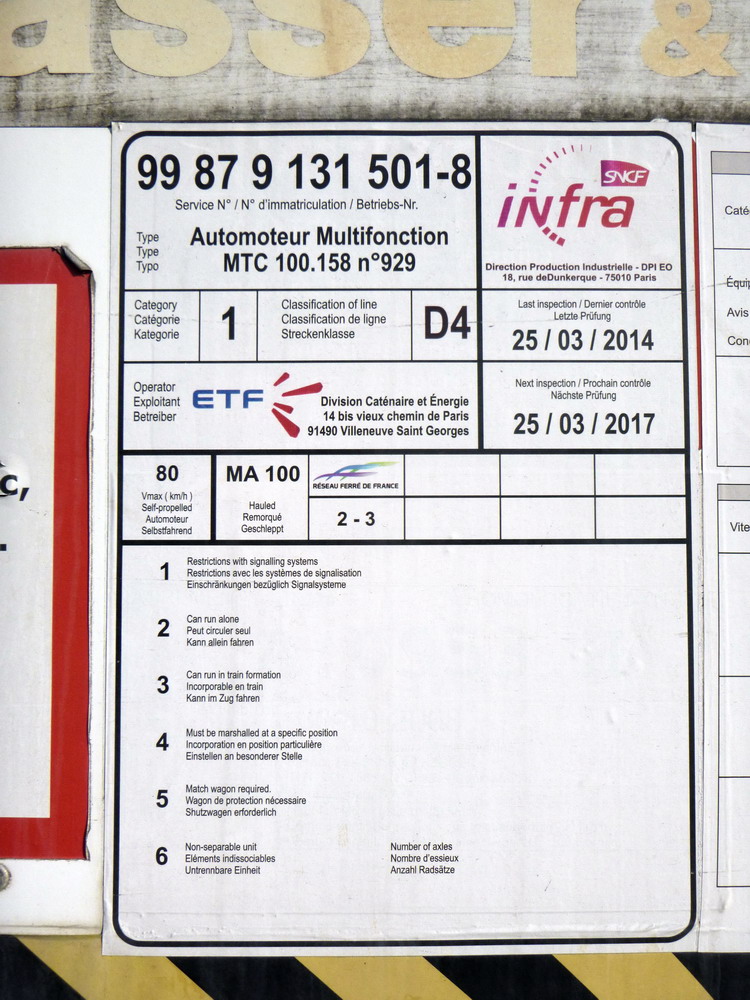 Autre info : numéro de série 929 de 2005 (ou date antérieure) agréé à l'époque SNCF / SNCB / CFL.