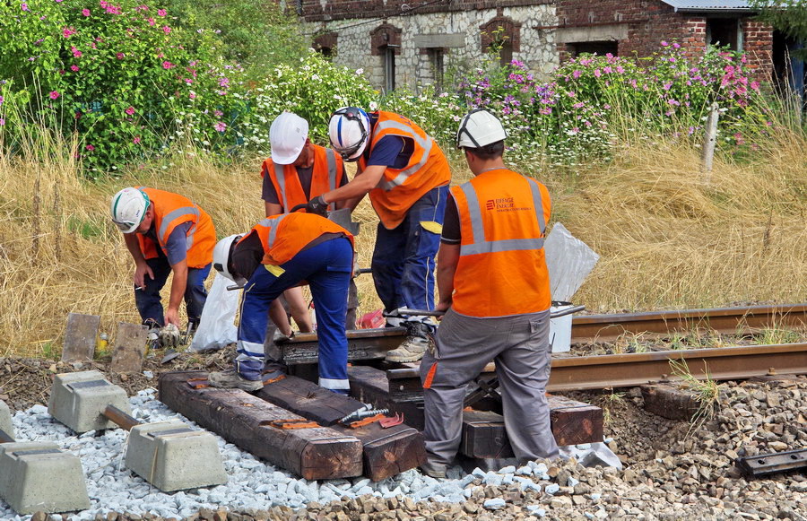 mise en place des novelles traverses en bois à la jonction de l'ancienne et de la nouvelle voie au niveau du PN n°92