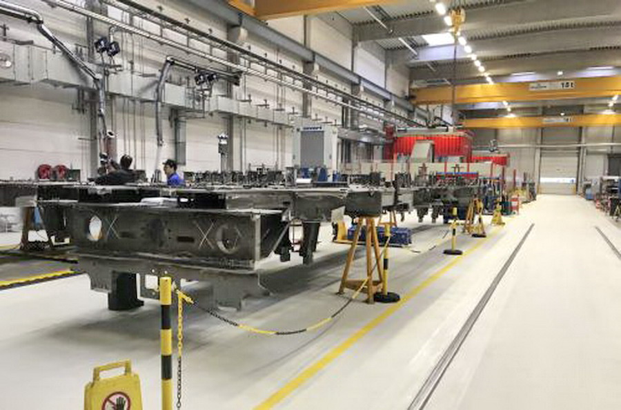 L'ensemble du site est conçu pour minimiser la distance entre les chantiers au fur et à mesure de la fabrication, les grues étant positionnées pour déplacer les composants vers des pistes qui circulent entre différentes zones de fabrication. Parmi ceux-ci, on peut citer le son, le premier pas avant la peinture qui se déroule dans une installation spécialement développée, l’un des investissements les plus coûteux. Des bogies sont également fabriqués sur place, tandis que l'entreprise a investi 10 millions d'euros dans de nouvelles machines. Parmi les plus impressionnants, citons un nouveau système laser, positionné au-dessus des sites de travail, qui permet de localiser précisément les composants individuels, ce qui accélère le processus de travail. Des tests dynamiques ont également lieu sur site, y compris pour les bogies et les systèmes auxiliaires, tandis que l'installation dispose de cinq locomotives et est connectée à la ligne principale via une voie de 800 m de long.